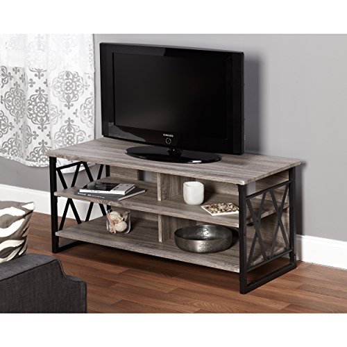 Keep your media gadgets organized in type with this sturdy TV stand. Designed for TVs as much as forty five inches, the country stand options robust X formed metal helps and an enthralling reclaimed gray end. Four cabinets present plentiful space for storing for elements or DVDs and CDs.Powder Coated Steel Frame