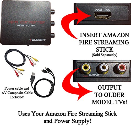 HDMI converter for Amazon Streaming Stick. This system will convert the excessive-definition HDMI output from the Amazon Streaming Stick into normal definition AV output utilized by most older-mannequin TVs. Includes HDMI to AV converter, energy cable, composite (pink/white/yellow) cable and directions. Installs in minutes.Use Amazon Streaming Stick with Older Model TVs! Converts HDMI sign from Amazon Streaming Stick into normal definition HDMI.