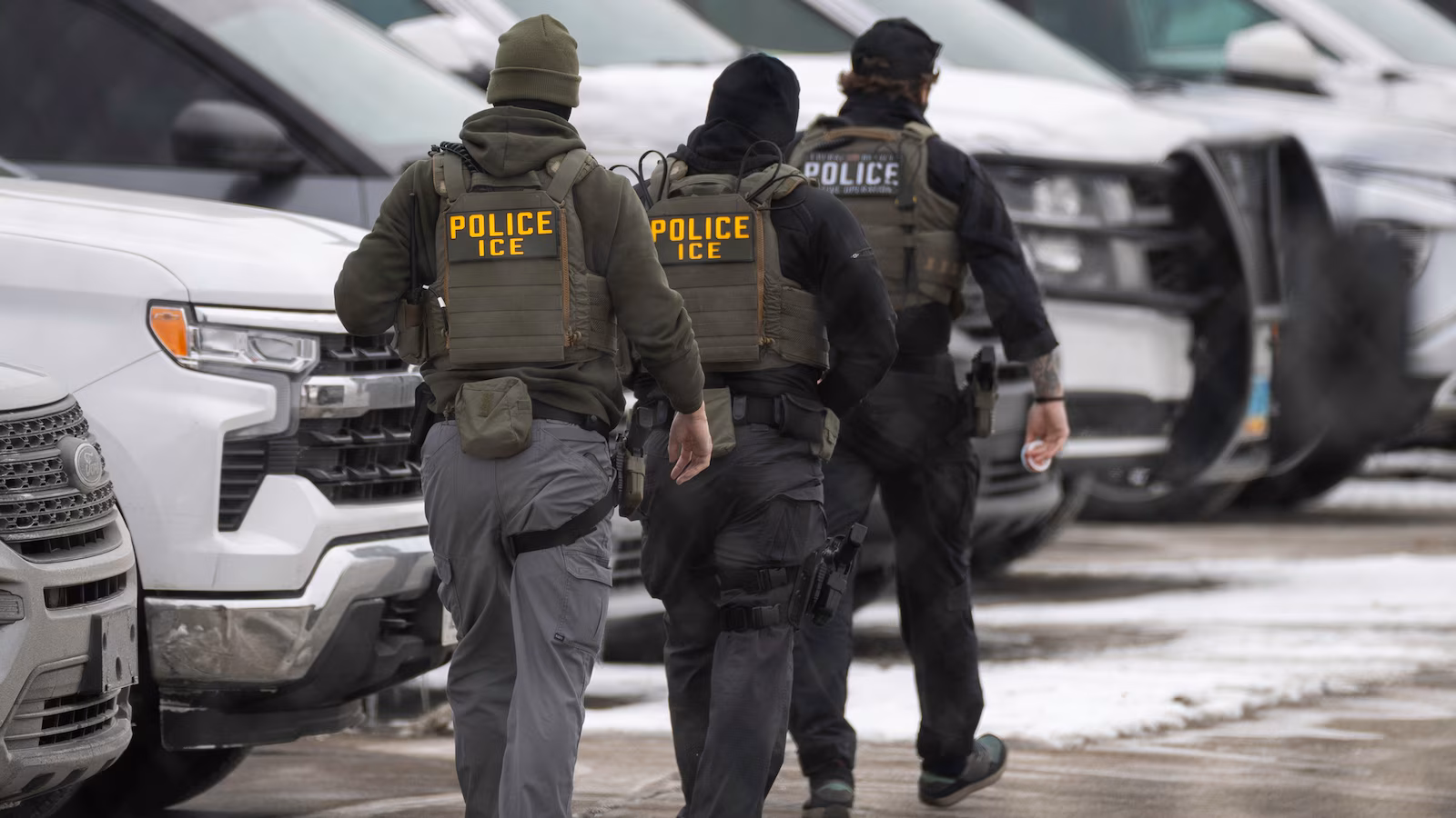 ICE agents depart the Bishop Henry Whipple Federal Building, Feb. 4, 2026, in Minneapolis.