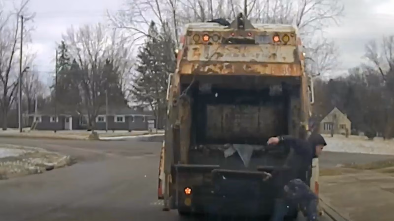 This image made from video provided by a Huber Heights police officer’s dash camera shows a suspect jumping out of a garage can and fleeing from police on Monday, Feb. 23, 2026, in Huber Heights, Ohio. (Huber Heights Police Department via AP)