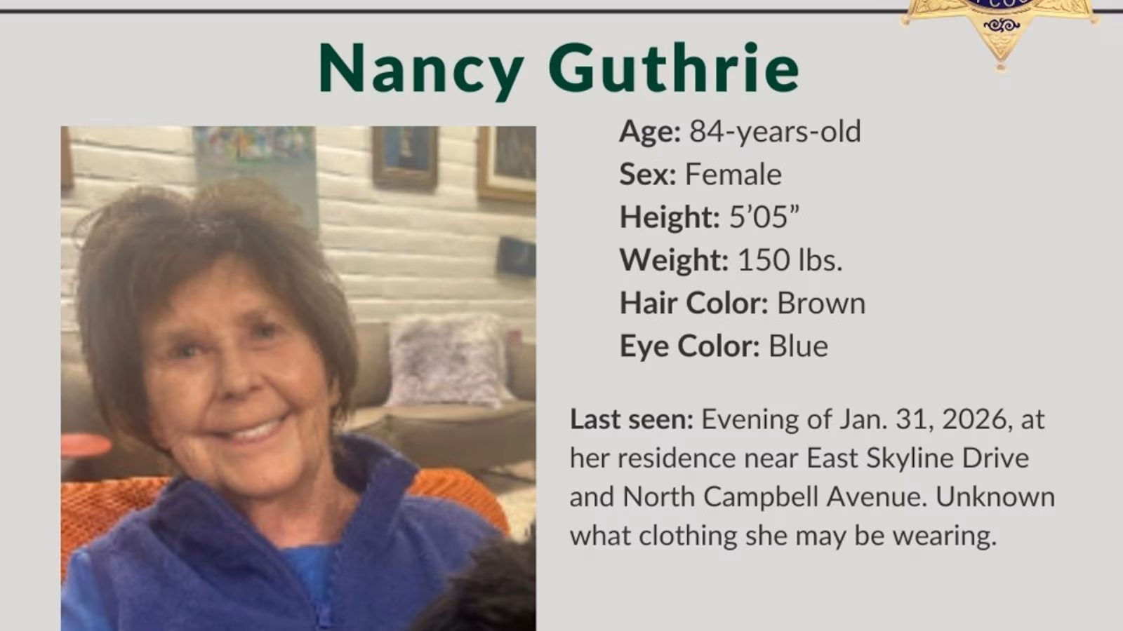 The Pima County Sheriff’s Department announced during a news conference on Sunday that Nancy Guthrie was last seen in the Catalina Foothills area on Saturday night at approximately 9:45 p.m.