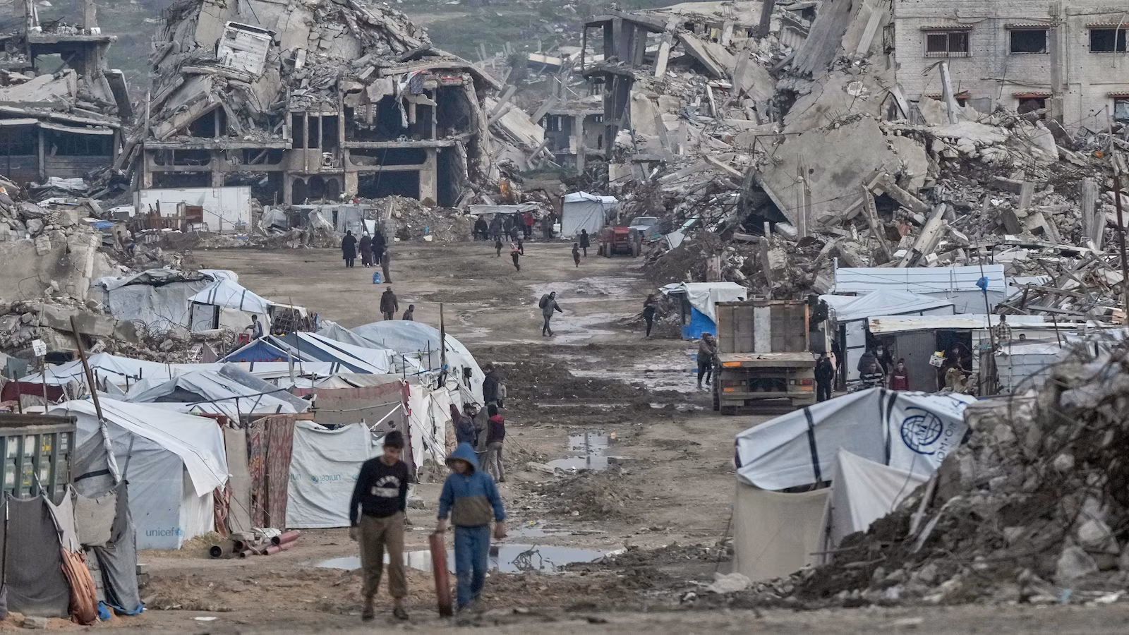Palestinians walk amid buildings destroyed by Israeli air and ground operations in the Zeitoun neighborhood of Gaza City, Jan. 14, 2026.