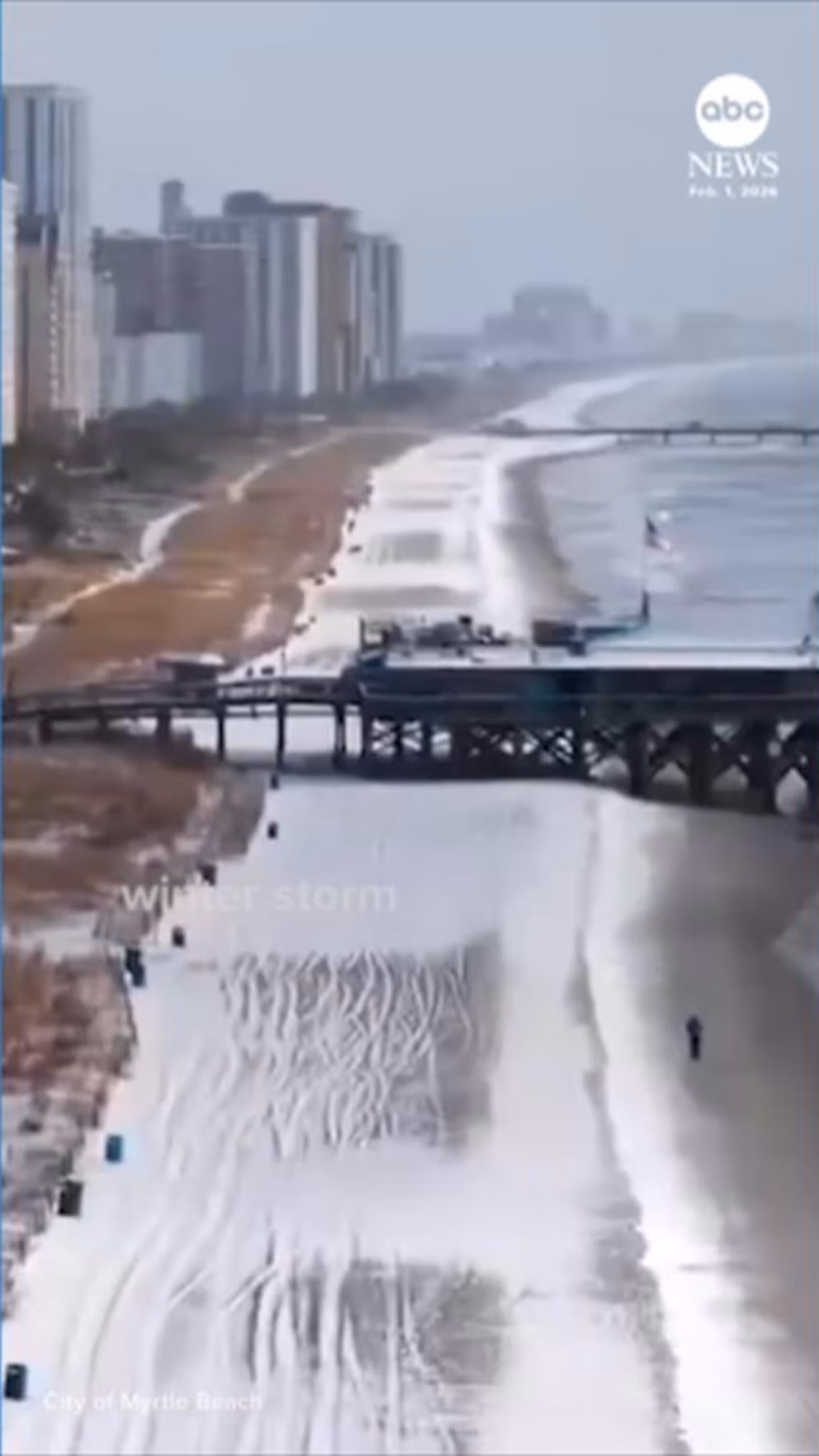 The City of Myrtle Beach shared drone footage Sunday of the popular South Carolina beach town after this weekend’s winter storm.