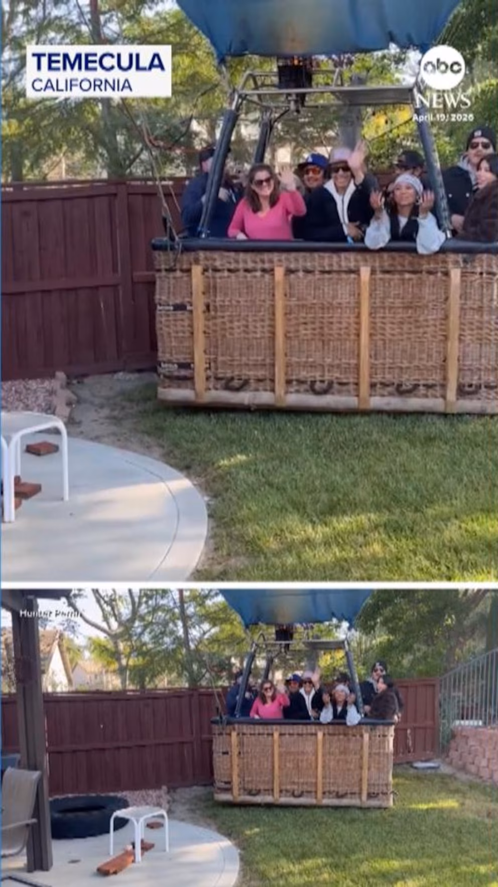 A hot air balloon with 13 people on board safely made an emergency landing in a Southern California family’s backyard.