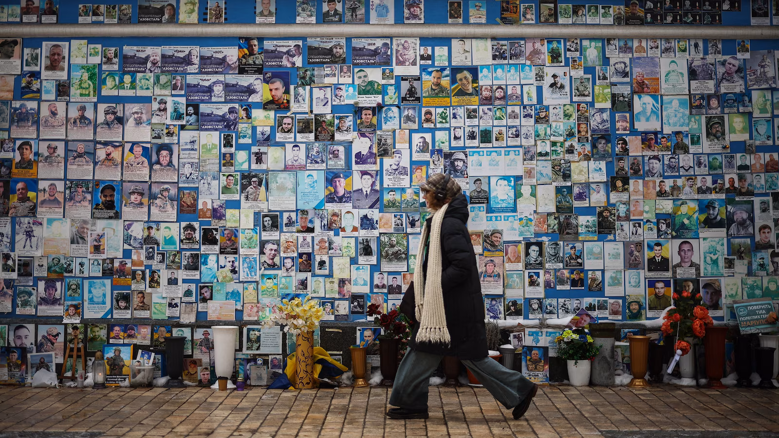 A person walks alongside The Wall of Remembrance of the Fallen for Ukraine in Kyiv on Feb. 23, 2026.